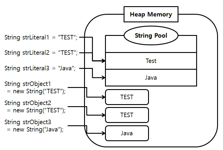 위 코드의 문자열 리터럴(Literal)과 new String() 객체의 Heap Memory 구조는 아래 그림과 같습니다.