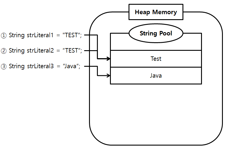 2. JVM이 String Pool에 "TEST"가 이미 존재하므로 strLiteral2은 1번 과정에서 생성된 "TEST"를 참조합니다.