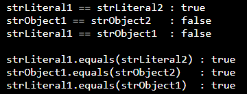System.out.println("strLiteral1.equals(strObject1) : " + (strLiteral1.equals(strObject1)));