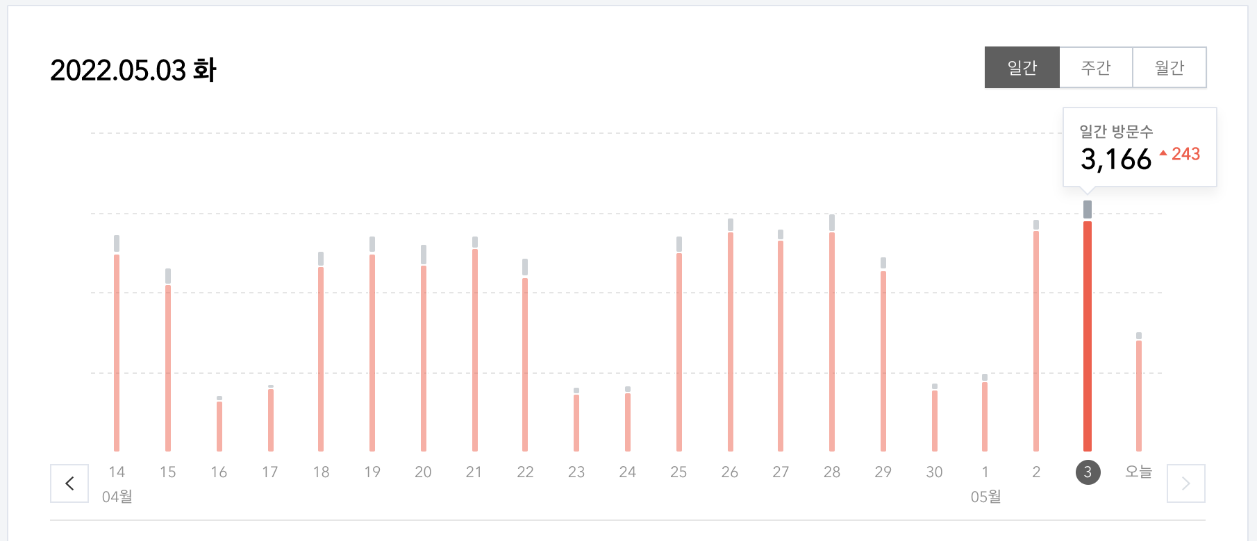 2022년 5월 3일 화요일 일일 방문수 3,166명 달성하였다.
