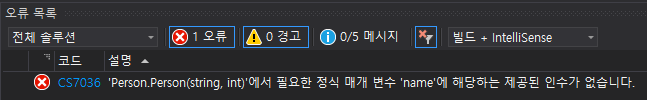 주의사항으로 클래스에 매개변수가 존재하는 생성자가 존재하는 경우 기본 생성자를 명시해야 합니다. 다음 예제를 실행하면 컴파일 에러가 발생합니다.