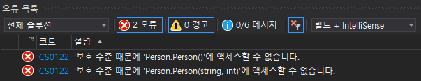 Person 클래스에 private 생성자가 존재하므로 Person 클래스 외부인 Program 클래스의 Main문에서 Person 클래스의 인스턴스를 생성할 수 없습니다.
