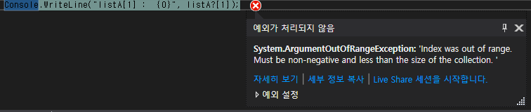 Console.WriteLine("listA[1] : {0}", listA?[1]);