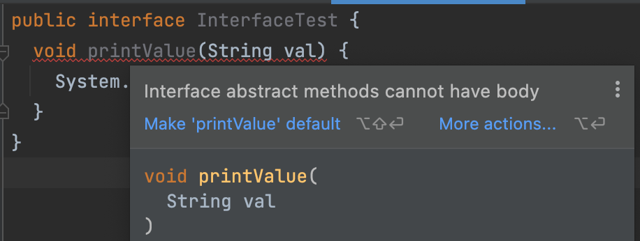 Java 8 이전에는 인터페이스 내부의 추상 메서드를 재정의하기 위해 인터페이스를 상속받는 클래스에서 추상 메서드를 재정의(Overriding)해야만 했습니다. 하지만, Java 8부터 도입된 default 키워드를 사용하면 인터페이스에서 메서드 본문을 구현할 수 있습니다.