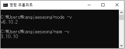 node 설치후 cmd에서 아래 명령어로 node와 npm이 설치가 되었는지 확인합니다.