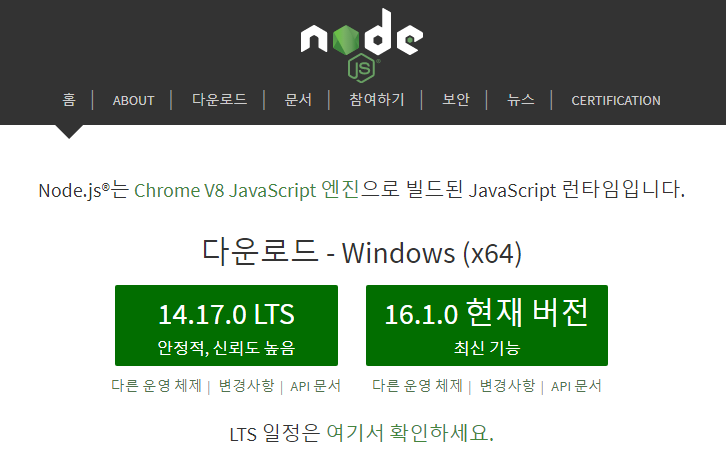 Node.js 다운로드 링크에 접속해서 node.js를 다운받습니다.