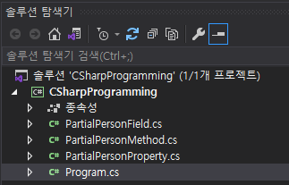 이제 Person 클래스의 필드, 프로퍼티, 메서드를 파일별로 관리하기 위해 세 개의 파일로 분할합니다. 다음은 필드를 관리하는 PartialPersonField.cs 파일입니다.