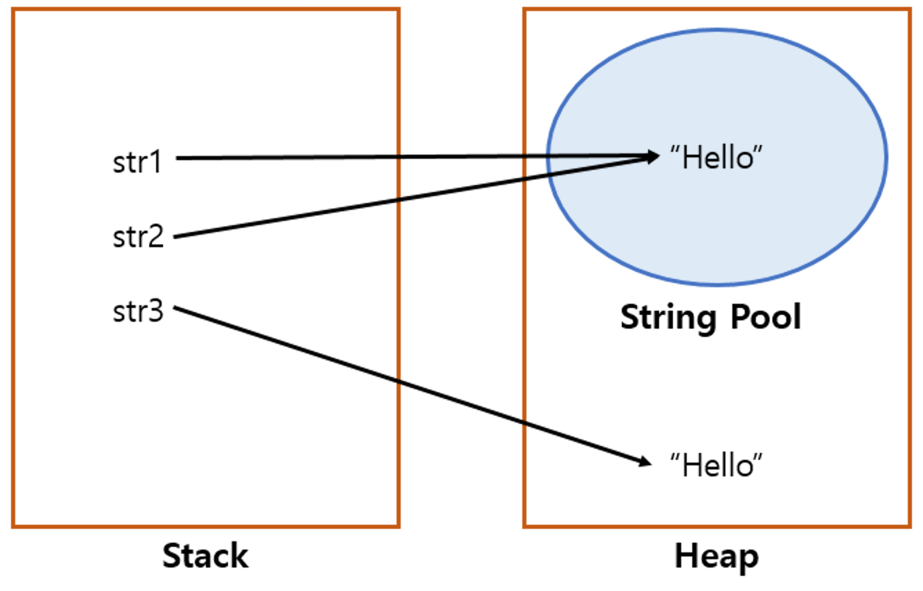 순서 3. 첫 번째 순서에서 "Hello"라는 문자열이 문자열 상수 풀에 저장되었으므로 문자열 변수 str3는 동일한 참조 값을 가집니다.