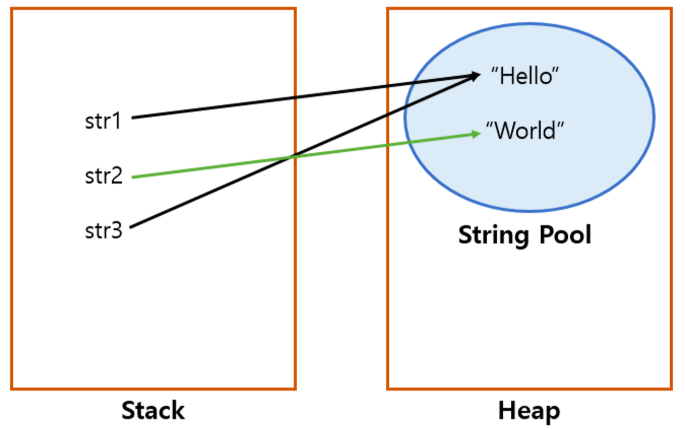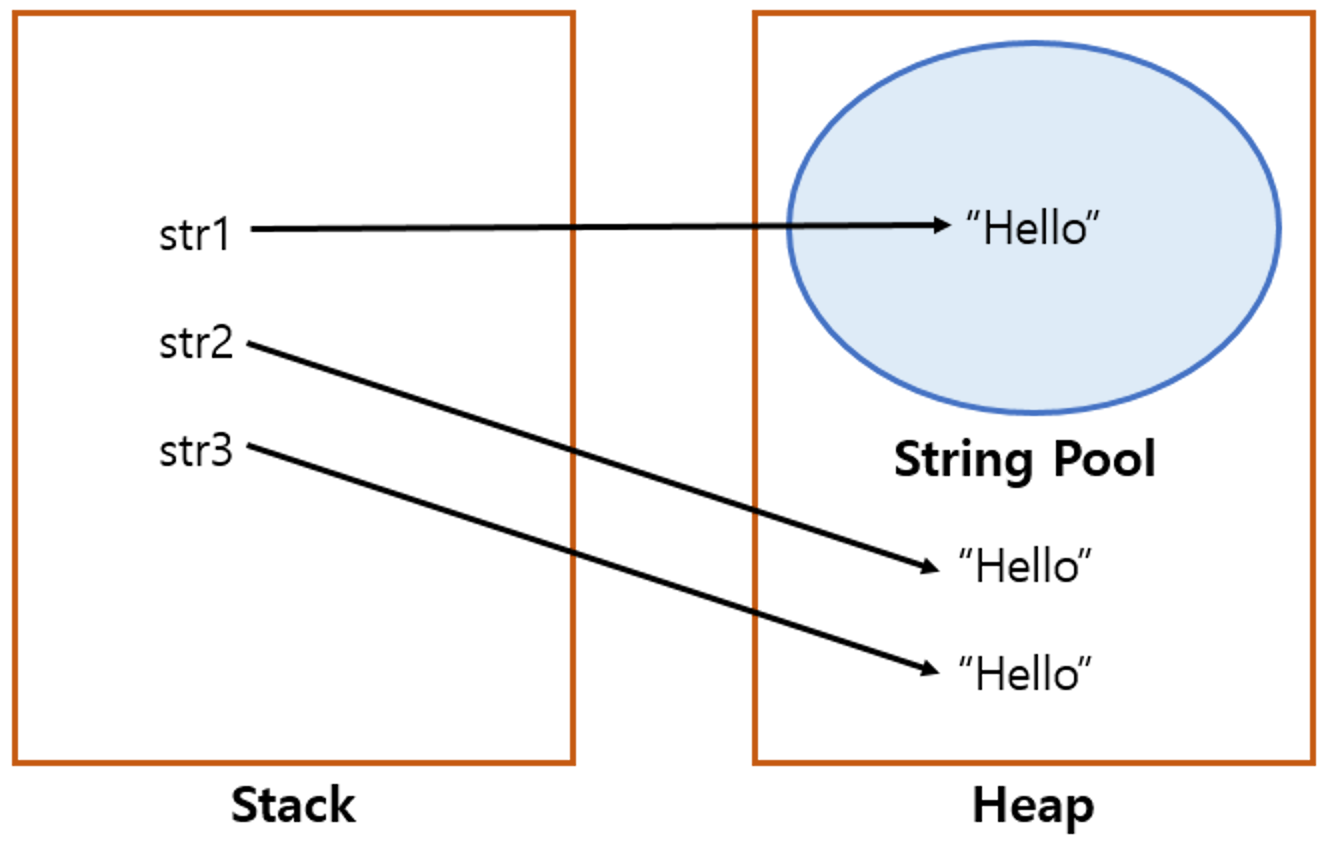 - 문자열 상수 풀에 동일한 문자열이 이미 존재하는 경우 새로운 문자열을 생성하지 않으므로 메모리 공간을 절약합니다.