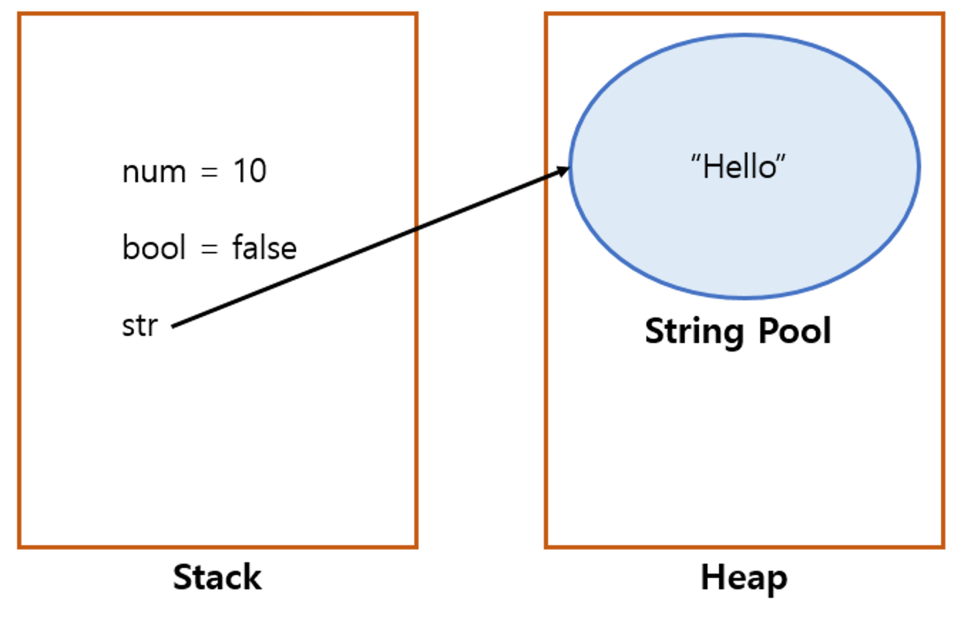 변수 num과 bool은 기본 타입이므로 데이터가 스택 영역에 존재합니다. 하지만, 변수 str의 타입은 String이므로 실제 데이터는 힙 영역에 존재하는 문자열 상수 풀에 존재합니다.