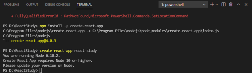 VS Code에서 create-react-app으로 프로젝트 생성 도중 Node.js의 버전이 낮아서 Node.js의 버전을 10 또는 그 이상의 버전으로 업데이트 해달라는 내용입니다.
