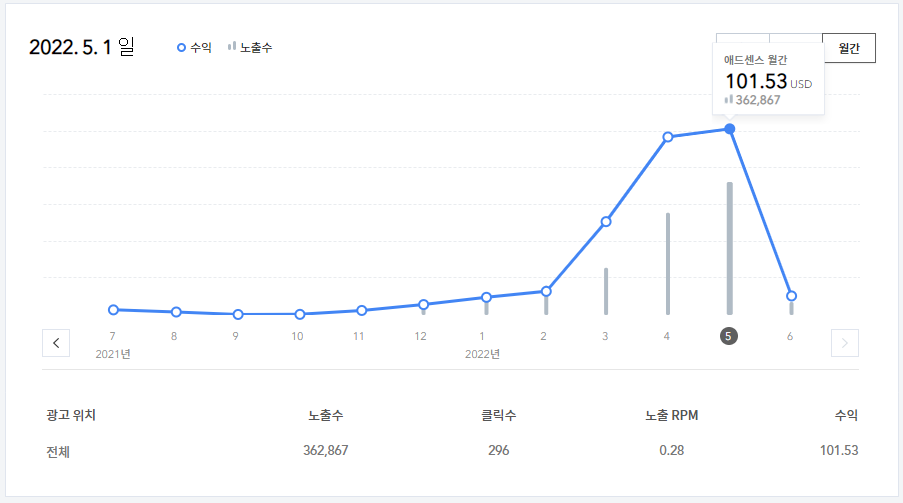 애드센스 수익은 $101.53입니다. 드디어 $100 달러를 달성했네요. 4월에 비해 큰 변화는 없으며, 천천히 상승하고 있습니다.