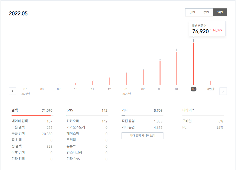 2022년 5월 방문수는 76,920입니다. 4월에 방문수는 60,523이었으며 1.2배 상승했습니다.