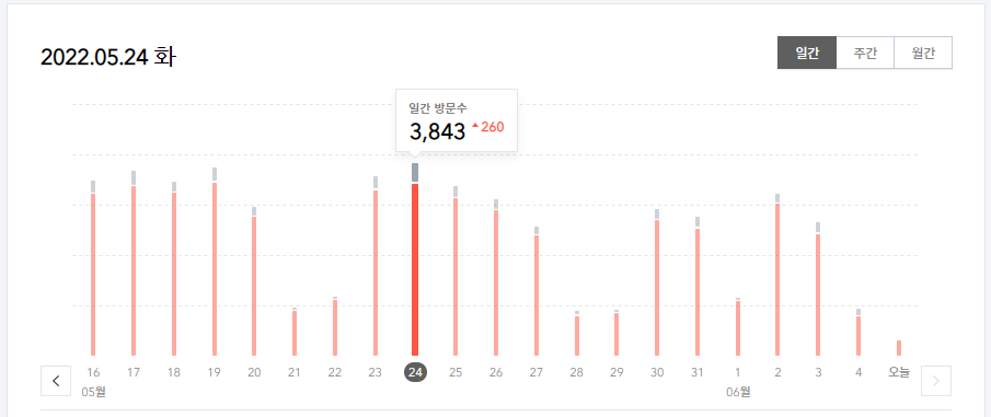 5월 최대 일일 방문수는 3,843입니다. 5월 최대 일일 방문수 목표가 3,500이었으므로 목표는 달성했습니다. 하지만, 6월 초 연휴가 많아서 그런지 방문수가 계속해서 감소하고 있습니다.