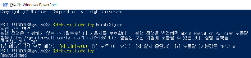 2. 실행 정책을 RemoteSigned로 변경 후 실행 정책이 변경이 되었는지 확인합니다.