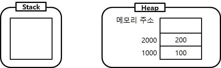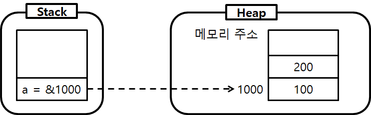 스택 영역에 생성된 변수 a는 힙 영역에 생성된 100의 주소값인 1000을 가지고 있습니다.
