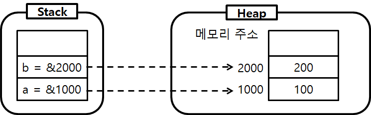 스택 영역에 생성된 변수 b는 힙 영역에 생성된 200의 주소값을 가지고 있습니다.