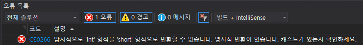 위에서 설명했듯이 암시적 타입 변환은 더 작은 데이터 타입의 값을 더 큰 데이터 타입에 할당하는 경우 발생합니다. 다음 예제처럼 int 타입 변수의 값을 int 타입보다 더 작은 타입인 short 타입 변수의 값에 할당하는 경우 오류가 발생합니다.