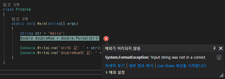 하지만, 다음과 같이 double 타입과 호환되지 않은 값을 Parse() 메서드로 변환하는 경우 런타임 오류가 발생합니다.