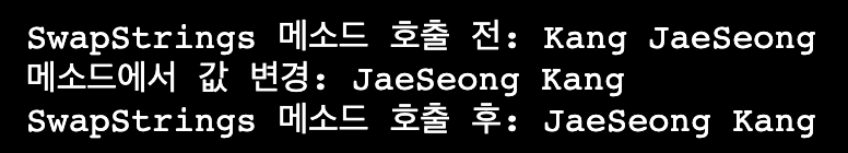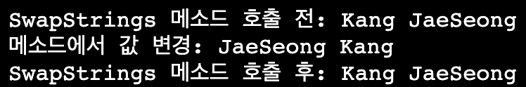 Console.WriteLine("SwapStrings 메소드 호출 후: {0} {1}", str1, str2);