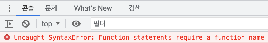 JavaScript의 익명 함수는 이름이 없는 함수입니다. 함수 표현식으로 익명 함수를 변수에 할당하지 않거나 또는 익명 함수를 소괄호로 감싸지 않으면 다음과 같이 함수 이름이 필요하다는 구문 오류가 발생합니다.