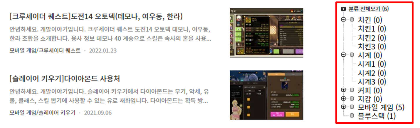 JB 스킨, hELLO 스킨, 미넴 스킨에서는 카테고리 접기/펼치기 기능을 지원한다. 카테고리 접기/펼치기 기능을 원하는 경우 해당 스킨을 사용하면 되고 직접 구현하고 싶은 경우 해당 포스팅 또는 서근님, 제이스토리님 블로그를 참고하자.