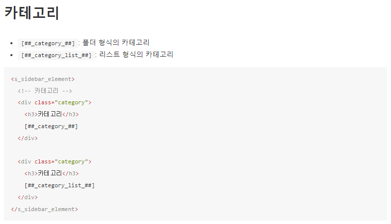 티스토리의 스킨 가이드로 이동하면 카테고리 치환자를 볼 수 있다. ##_category_## 치환자는 카테고리가 접힌 상태 ##_category_list_## 치환자는 카테고리가 펼쳐진 상태를 의미한다.