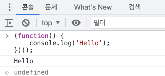 JavaScript는 함수에 return문을 작성하지 않아도 값이 반환됩니다. Chrome 개발자 도구의 콘솔에서는 JavaScript 코드를 작성할 수 있는데, 다음 예제처럼 즉시 실행 함수를 사용하면 Hello와 undefined가 출력되는 것을 확인할 수 있습니다.
