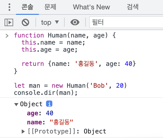 - 생성자 함수에서 return문에 명시된 값의 타입이 원시 타입인 경우 return문은 무시됩니다.