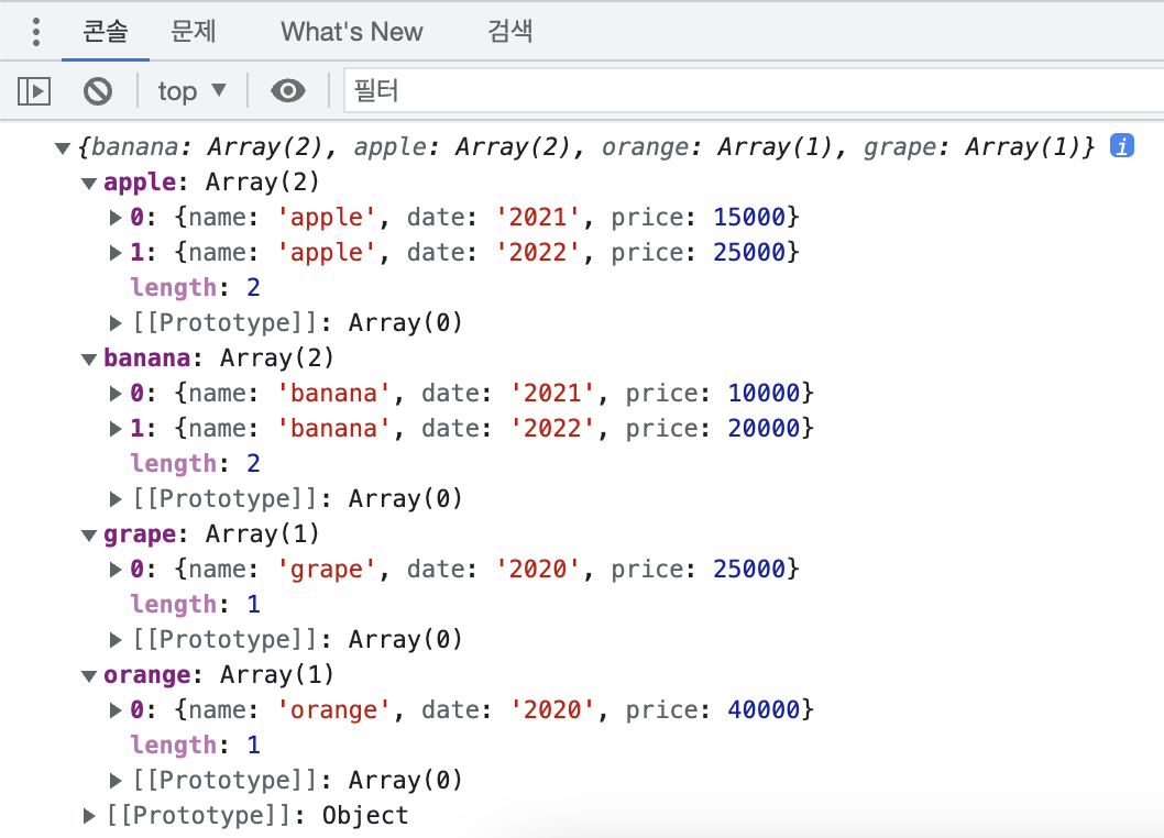 이 배열을 다음과 같이 과일별로 그룹화하거나