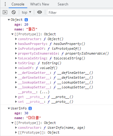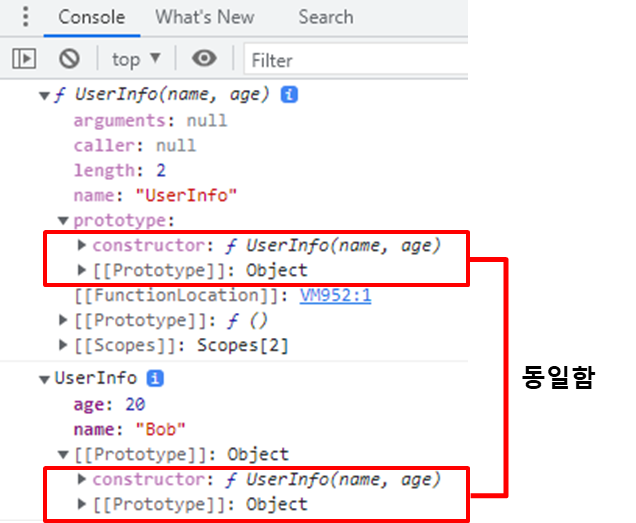 객체 리터럴 방식은 생성자가 Object()이며, 생성자 함수 방식은 생성자가 UserInfo()입니다. 프로토타입이 다르므로 상위 객체가 다르다는 것을 알 수 있습니다.