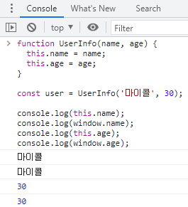 브라우저에서 this는 window 객체를 가리키므로 UserInfo() 함수에서 name, age 프로퍼티가 window 객체의 프로퍼티로 생성됩니다.