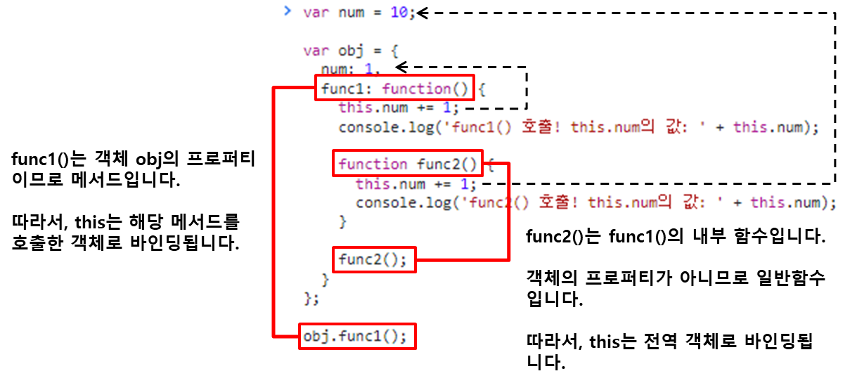 - 메서드의 내부 함수는 일반 함수이므로 내부 함수의 this는 전역 객체로 바인딩됩니다.