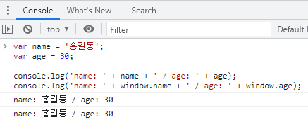 전역 변수인 name과 window.name이 동일한 값을 출력합니다. 동일한 값이 출력되는 이유는 전역 변수가 window 객체의 프로퍼티로 저장되기 때문입니다.
