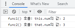 console.log('func2() 호출! that.num의 값: ' + that.num);