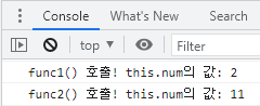 console.log('func2() 호출! this.num의 값: ' + this.num);