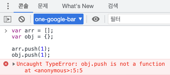 Array에는 push() 함수가 존재하지만, Object에는 push() 함수가 존재하지 않으므로 객체 obj가 push() 함수를 호출하는 경우 위 예제처럼 TypeError가 발생합니다.
