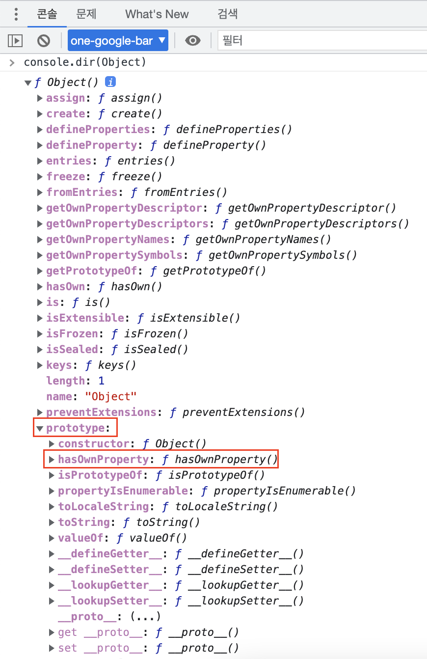 다음 사진은 Object의 prototype 프로퍼티에 hasOwnProperty() 함수가 존재한다는 것을 보여줍니다.
