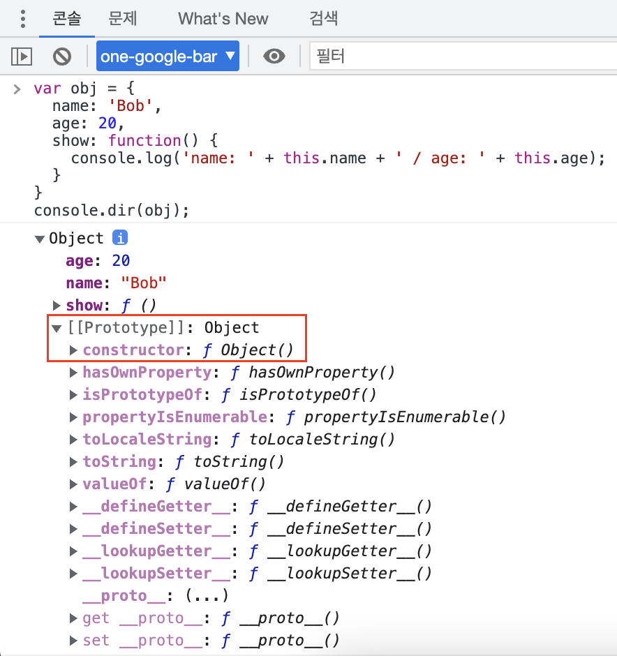 JavaScript에서 프로토타입 체인의 종점은 Object.prototype 객체입니다. 위 예제에서 살펴봤듯이 객체 리터럴 방식이나 생성자 함수를 사용한 방식이나 Object.prototype 객체에서 프로토타입 체인이 끝나므로 Object의 프로퍼티를 사용할 수 있었습니다.