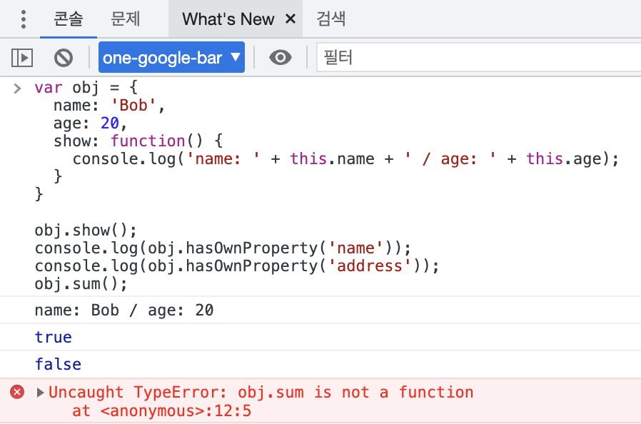 hasOwnProperty() 함수는 문자열로 넘긴 값이 프로퍼티로 존재하는 경우 true를 반환하고 그렇지 않으면 false를 반환하는 JavaScript 표준 API입니다. 객체 obj에는 name 프로퍼티가 존재하므로 true, address 프로퍼티는 존재하지 않으므로 false가 반환되었습니다.