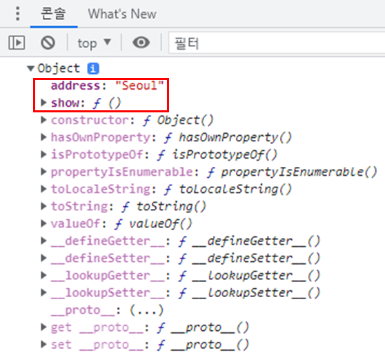 Object.prototype 객체를 확인하면 address, show 프로퍼티가 추가된 것을 확인할 수 있습니다. 즉, 프로토타입은 객체이며, 프로퍼티를 추가할 수 있습니다.