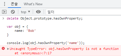 hasOwnProperty 프로퍼티가 제거되었으므로 객체에서 hasOwnProperty 메서드를 호출할 수 없습니다. 따라서, 프로토타입 객체의 프로퍼티를 제거하는 경우 JavaScript 표준 API를 제거하지 않도록 주의할 필요가 있습니다.