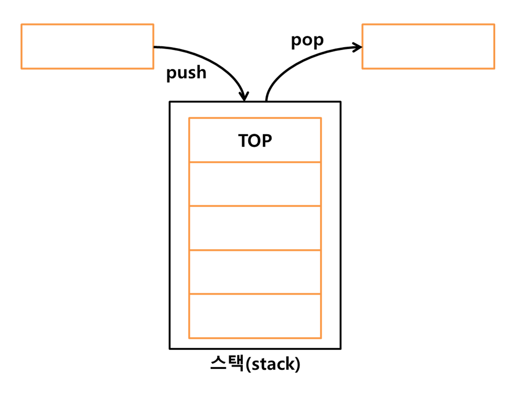 스택에서는 두 가지 작업을 수행할 수 있습니다. 맨 위(TOP)에 요소를 삽입하는 push, 맨 위(TOP)의 요소를 삭제하는 pop을 수행합니다.