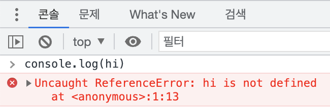 일반적으로 선언되지 않은 변수를 접근할 수 없습니다. 마찬가지로, JavaScript에서도 선언되지 않은 변수를 접근할 수 없으며, 선언되지 않은 변수를 접근하면 ReferenceError가 발생합니다.