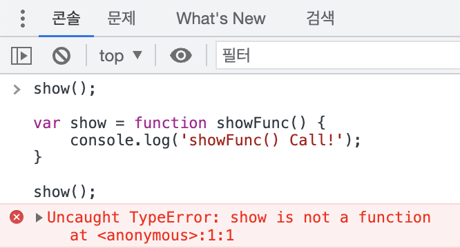 에러가 발생하는 이유는 변수 show는 호이스팅 되지만, 함수를 할당(=초기화)하는 것은 호이스팅 되지 않습니다. 따라서, 인터프리터는 변수 show를 함수가 아닌 일반 변수로 취급하므로 TypeError가 발생합니다.