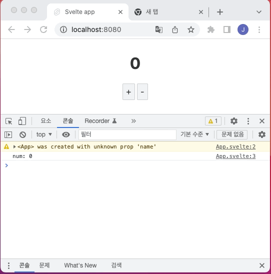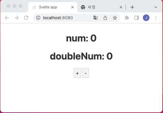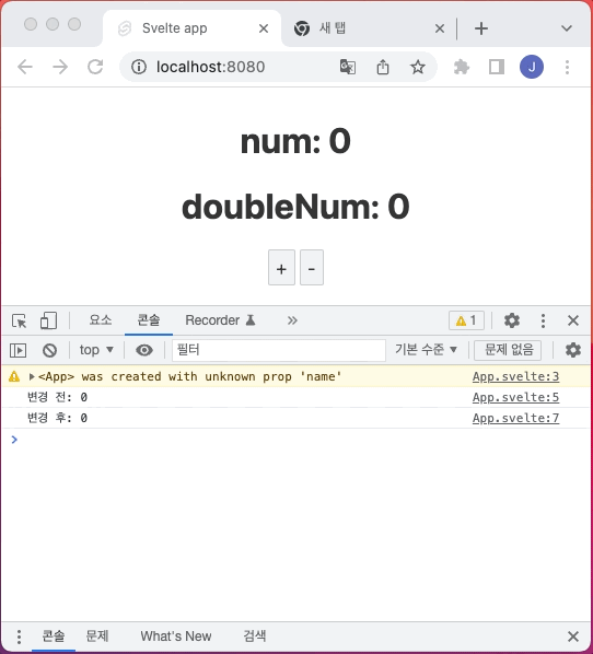 다음 예제는 + 버튼을 클릭하면 상태 num의 값이 1 증가하고, - 버튼을 클릭하면 1 감소합니다. 리액티브 구문을 사용하여 상태 num의 값이 변경될 때마다 num의 값을 콘솔에 출력합니다.