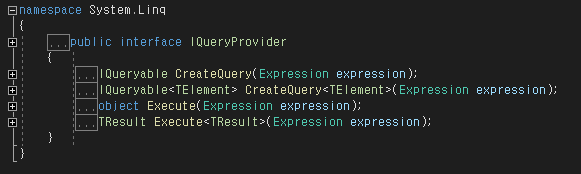 IQueryable 인터페이스에는 IQueryprovider 인터페이스 타입인 Provider 프로퍼티가 존재합니다. IQueryProvider 인터페이스를 살펴봅시다.
