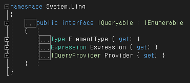 IQueryable 인터페이스는 IEnumerable 인터페이스와 달리 System.Linq 네임스페이스에 정의되어 있으며, IEnumerable 인터페이스의 자식 인터페이스입니다.