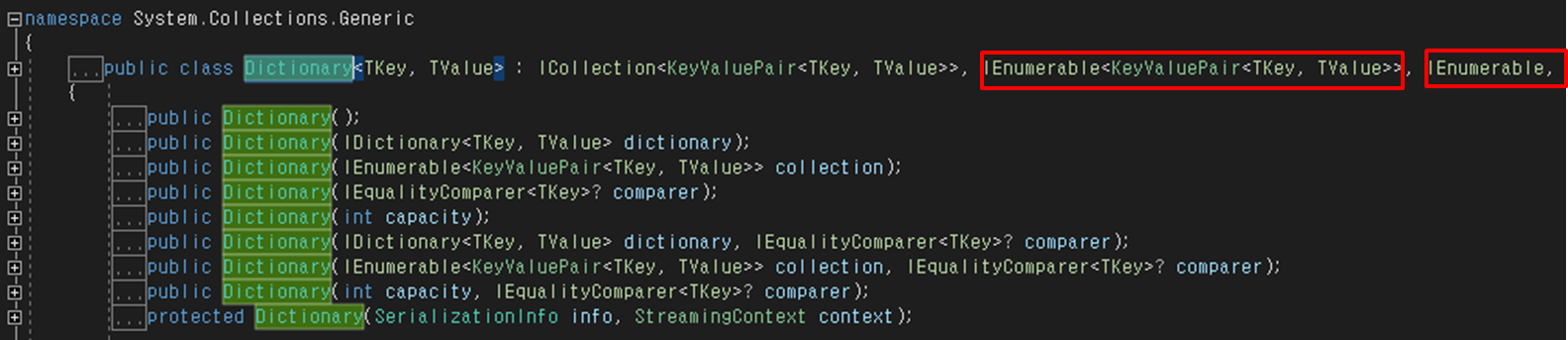 이제, IEnumerable 인터페이스가 무엇인지 알아봅시다. IEnumerable 인터페이스는 System.Collection 네임스페이스에서 사용할 수 있는 인터페이스로 대부분의 컬렉션 클래스는 IEnumerable 인터페이스를 구현합니다.
