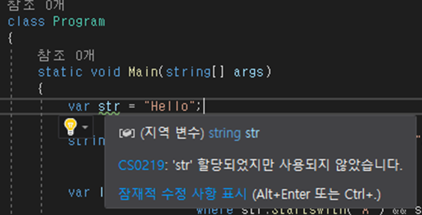 var 키워드는 익명 타입으로 C# 컴파일러가 할당된 값을 확인 후 타입을 정합니다. 다음 사진처럼 var 키워드로 선언된 변수 str에 문자열 "Hello"를 초기화했으므로 컴파일러는 변수 str의 타입을 string으로 설정합니다.